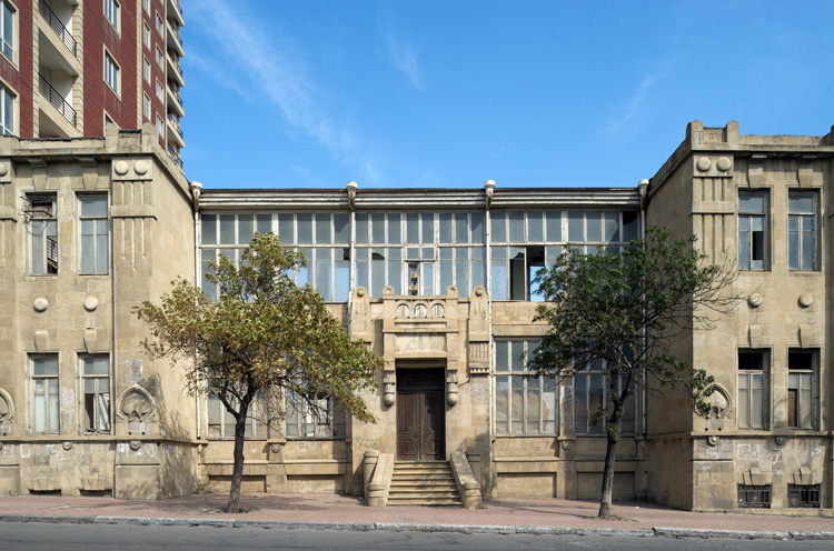 В 1910 году по соседству возник еще один дом, имеющий прямое отношение к деятельности общества. В память о рано умершем сыне (вспомним историю с «Исмаилией») другой состоятельный нефтепромышленник пожертвовал двадцать четыре тысячи рублей на постройку сиротского приюта. Имя архитектора, как, увы, нередко бывает, до нас не дошло, но он проявил немалую изобретательность, соединив в одном объеме форму характерного для Баку застекленного балкона-шушебенда с орнаментальной графикой модерна. Неизвестный зодчий противопоставил сильно выдвинутые, мощно трактованные каменные ризолиты сплошному остеклению центра и отметил вход крыльцом, выполненным из блоков местного камня.