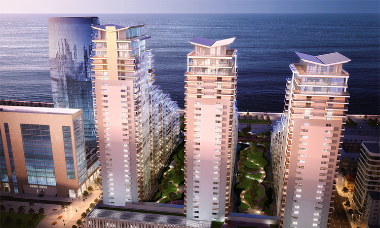 Те, кто когда-либо бывал в приморских городах, где на берегу много высотных зданий, помнят неприятное ощущение дисгармонии между ровной водной гладью и нависающими 20–30-этажными стенами. В данном случае ступенчатость комплекса создает более комфортную ситуацию не только для тех, кто там живет, но и для тех, кто на берегу.