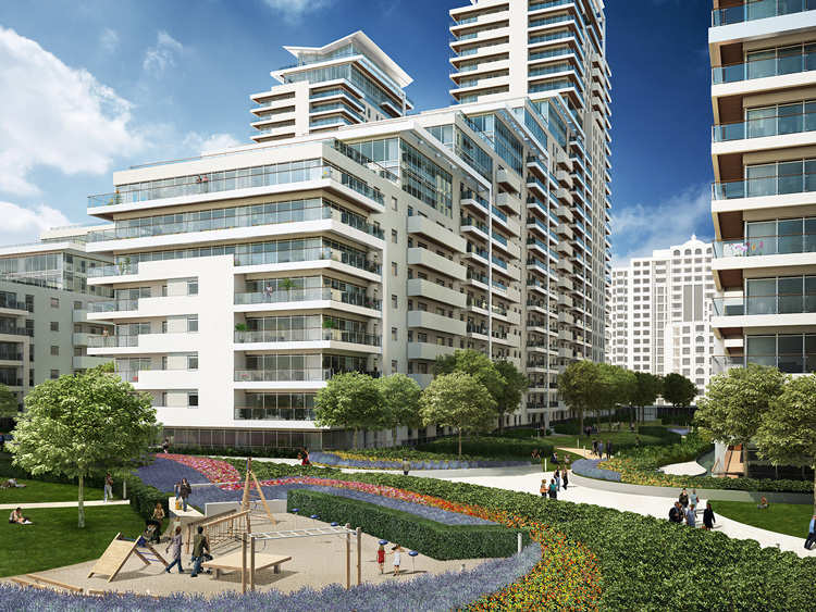 Несмотря на то что эти части спроектированы разными архитекторами (жилье – Broadway Malyan, офисы – Chapman Taylor), они образуют любопытный ансамбль. Внешний облик каждого элемента отвечает своей функции. Офисные башни более собранные и стройные, как и положено коммерческой недвижимости класса «А», где эффективность – одно из ключевых понятий. Жилые здания открываются в сторону моря каскадом террас, что создает более респектабельный образ. В свою очередь подиум жилого блока, повторяющий дугу дороги, как бы затягивает в вихрь «радости и покупок», столь активно пропагандируемый нынешними шопинг-моллами. Все вместе получается достаточно разнообразно и при общей глянцевости, стройности и четкости соединяет в себе элементы частного и публичного, домашней расслабленности и рабочей сосредоточенности, что отвечает представлению о современном стиле успешного образа жизни.