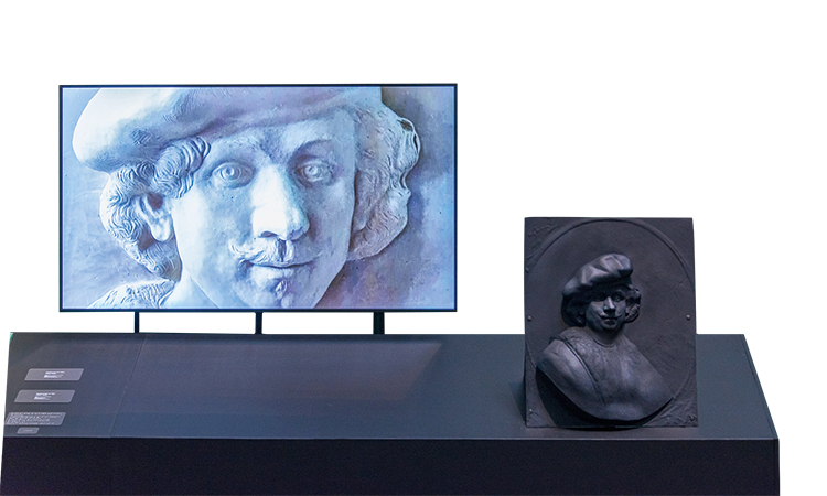 Один из экспонатов выставки – объемная копия знаменитой картины Рембрандта «Автопортрет с затемненными глазами» из собрания Лейденской коллекции (США). Оригинал уже выставлялся в Эрмитаже в 2018 году, когда здесь проходила выставка «Эпоха Рембрандта и Вермеера». Копию портрета изготовили в лаборатории научной реставрации металлов Эрмитажа: сначала на компьютере создали трехмерную модель изображения, а затем на ее основе сделали барельеф, в точности передающий все детали картины, в том числе тень, падающую на глаза молодого художника.