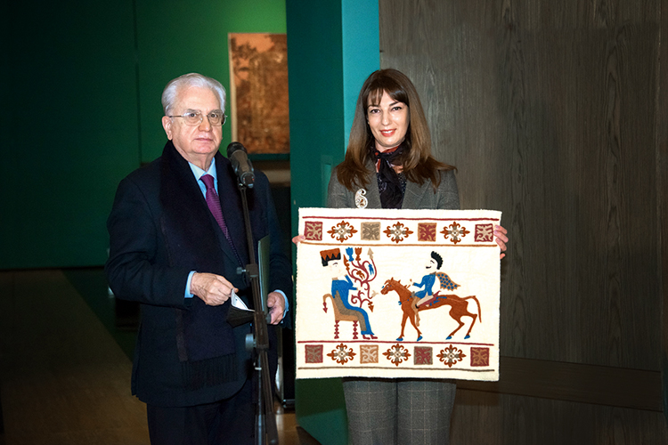 Директор Эрмитажа Михаил Пиотровский поблагодарил Музей ковра за сотрудничество и сообщил, что его институция преподносит в дар АНМК один из экспонатов выставки – войлочную реплику фрагмента покрывала для юрты из Пазырыкского кургана с изображением всадника и божества.