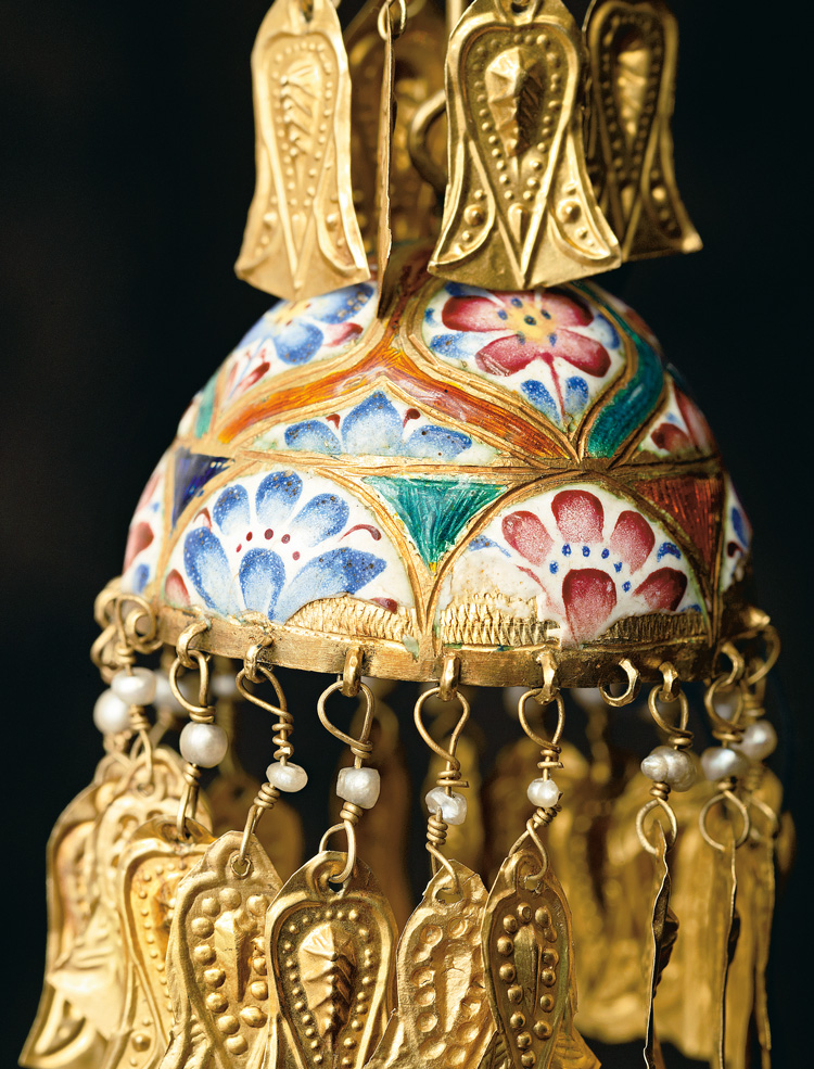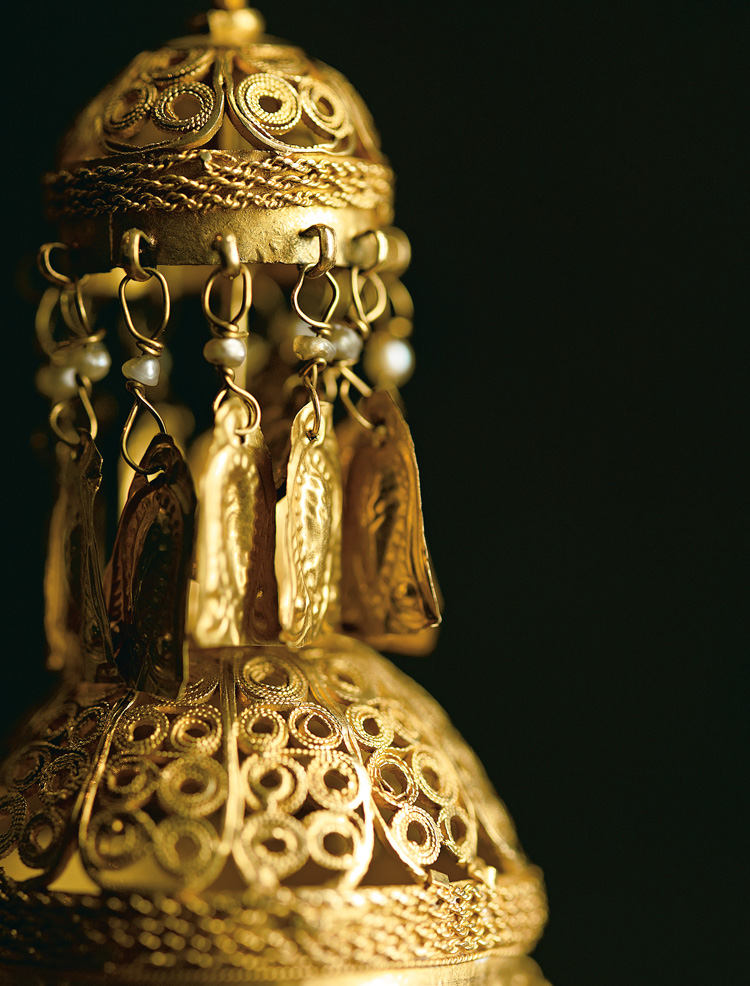 Серьги. «Пиале зенг» («Звучащая пиала»). Золото, филигрань, жемчуг. Серьги получили такое название из-за пиалообразных элементов и подвесок, которые звенят при движении.