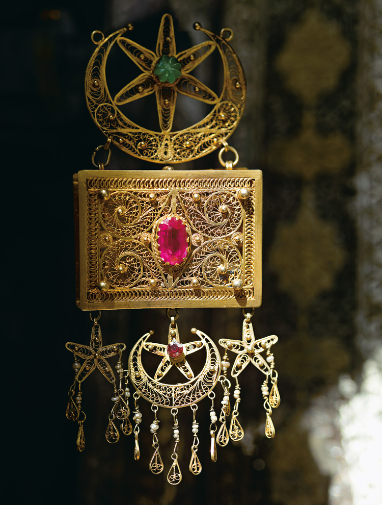 Кулон «Гуран габы» («Футляр для Корана»). Золото, филигрань, зернь, вставки из цветного стекла и бирюзы. XIX в. Баку.