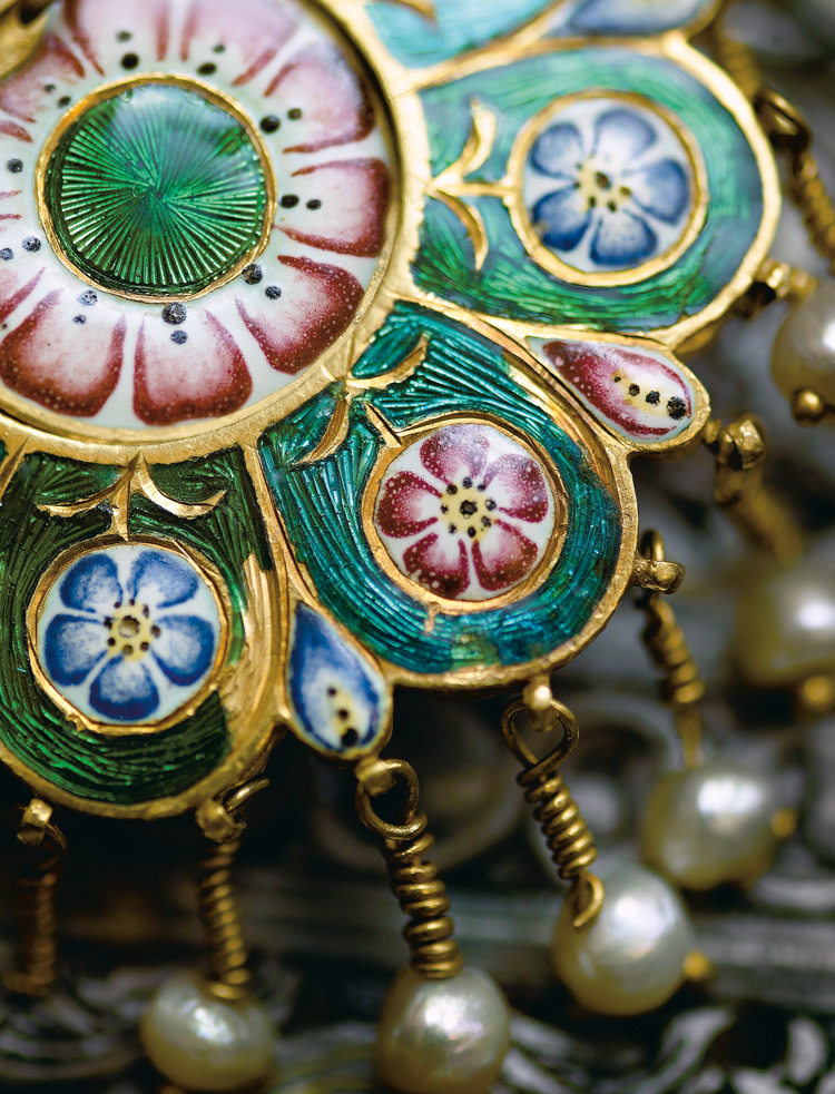 Кулон. Золото, эмаль, жемчуг, рубины, алмазы. Первая половина XIX в. Баку. Кулон двусторонний (оборотная сторона). Украшен растительным орнаментом из эмали. Подвески из жемчуга.