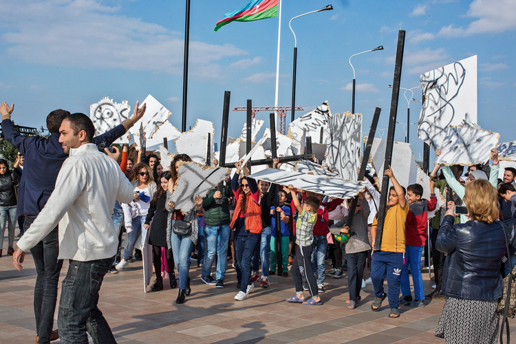 К.Ф.: Это тоже зависит от специфики акции и места, где она проводится. Желательно, чтобы это был материал, из которого можно быстро сделать что-то цельное. Например, в Баку я использовал строительный картон.