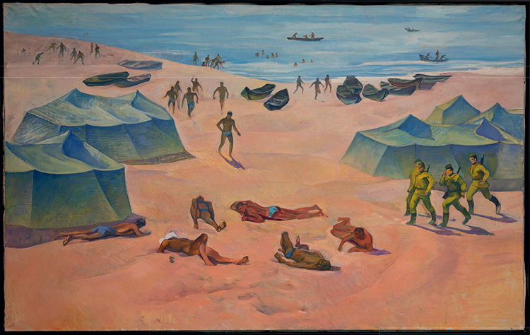 Полотном «Женщина, лежащая на берегу моря» Мирнадир Зейналов демонстрирует совершенно иной язык. Здесь нет нефтяников, почти не видно моря. Но сквозь модернистские поиски гиперформ, явно вдохновленные Пикассо, проступает та же томительность летнего зноя, как и на полотне «Эхо тишины», написанном в 2010 году художником совсем другого поколения Гюндузом Хунларом, – его тоже можно увидеть на выставке.