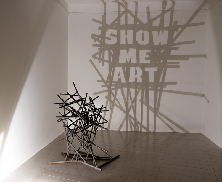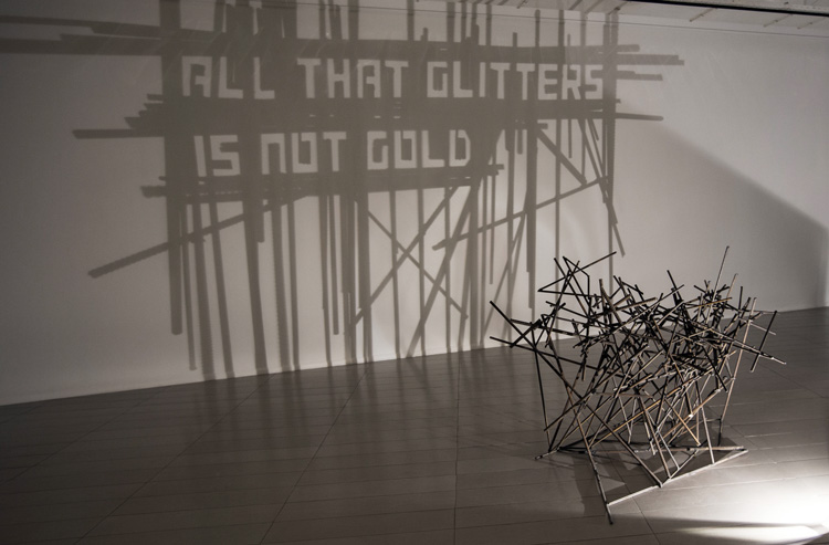 Название выставки полностью отражает ее концепцию. За аттракционом светотени просвечивают фразы: «Если ты утверждаешь, что это не искусство, то покажи мне искусство», «Не все то золото, что блестит», «Откуда пришел, куда идешь». В луче света, пробивающегося сквозь нагромождения арматуры, эти слова приобретают новые подтексты, рождающие множество вопросов. К кому они обращены? Это утверждения или вопросы? Какие чувства будят в нас эти фразы? Где ключ к ним? Может быть, в последнем зале? Здесь на противоположных стенах два автопортрета, волшебным образом пробивающиеся сквозь металлоконструкции, спаянные из множества слов «цель» и «надежда». Если приглядеться внимательнее, можно обнаружить, что портреты разнятся, и один выглядит более уверенным и оптимистичным.