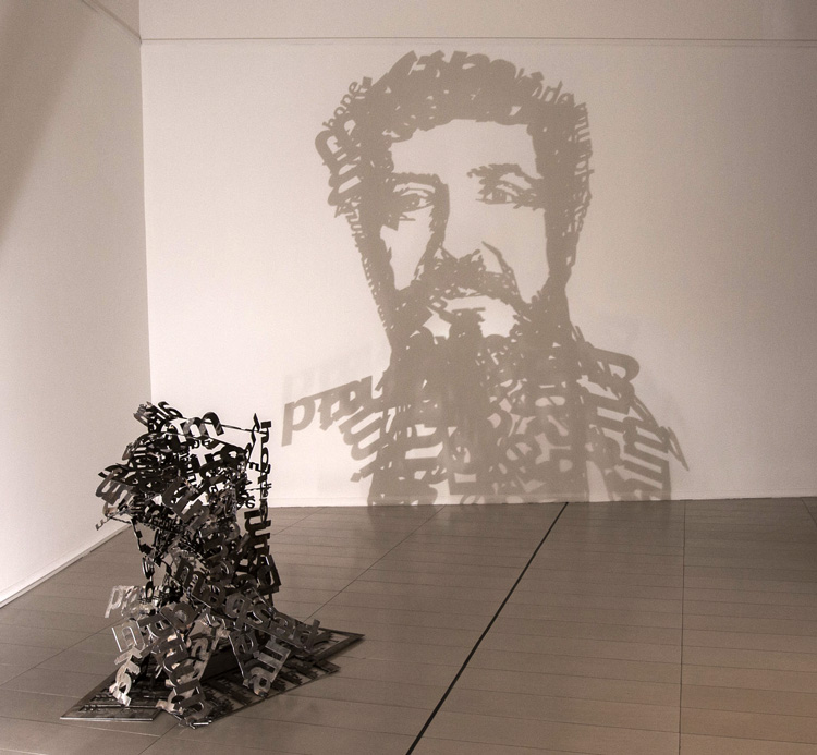 Наверняка каждый из нас открывал для себя в детстве магию тени от собственной руки, преломленной в луче света: легкое движение, и – о чудо! – рука превращается в птицу или животного. Точно так же, проникая за темную штору, прикрывающую вход в экспозицию, мы вспоминаем знакомое детское ощущение. Затемненные залы подсвечены лишь лучами прожекторов, направленных на странного вида невнятные и «лохматые» металлоконструкции. Нехитрая, на первый взгляд, затея: перед нами луч света, дальше – объект, сквозь который проникает свет, еще дальше – картина на стене. Впрочем, зритель воспринимает все с точностью до наоборот: первой магически притягивает взор именно картина, сотканная из света и тени, а дальше взгляд движется вслед за вопросом, возникающим у каждого попадающего в плен иллюзии Рашада Алекперова: «Как это сделано?!» И тогда фон и фигура меняются местами: начинается подробное и придирчивое изучение конструкции, из которой выходит картина.