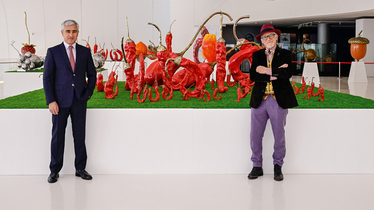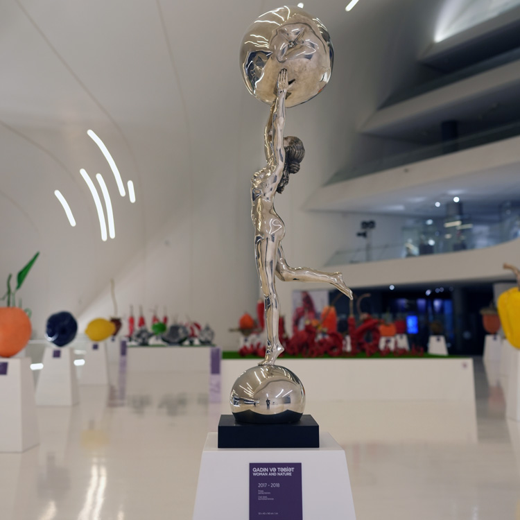Д.К.: Выставка родилась благодаря приглашению Центра Гейдара Алиева и лично Анара Алакбарова, который где-то видел мои работы, и они ему так понравились, что он захотел организовать выставку в Баку. За год подготовки я сделал немало скульптур, посвященных азербайджанской теме: среди них гранат в позолоченной бронзе, фундук, маленькие острые перчики – в такой версии они отливались только для Азербайджана. Сказать честно, до приглашения я не очень много знал об Азербайджане, только где он находится. Баку с первого взгляда влюбил меня в себя своими геометрическими формами, тянущимися в небо. И конечно, здание Захи Хадид, эти мягкие линии, которые складываются в какое-то бесконечное повторение. Было невероятно приятно выставить здесь мои скульптуры, потому что они тоже стремятся к тому, чтобы превращать пространство в мягкое и бесконечное.