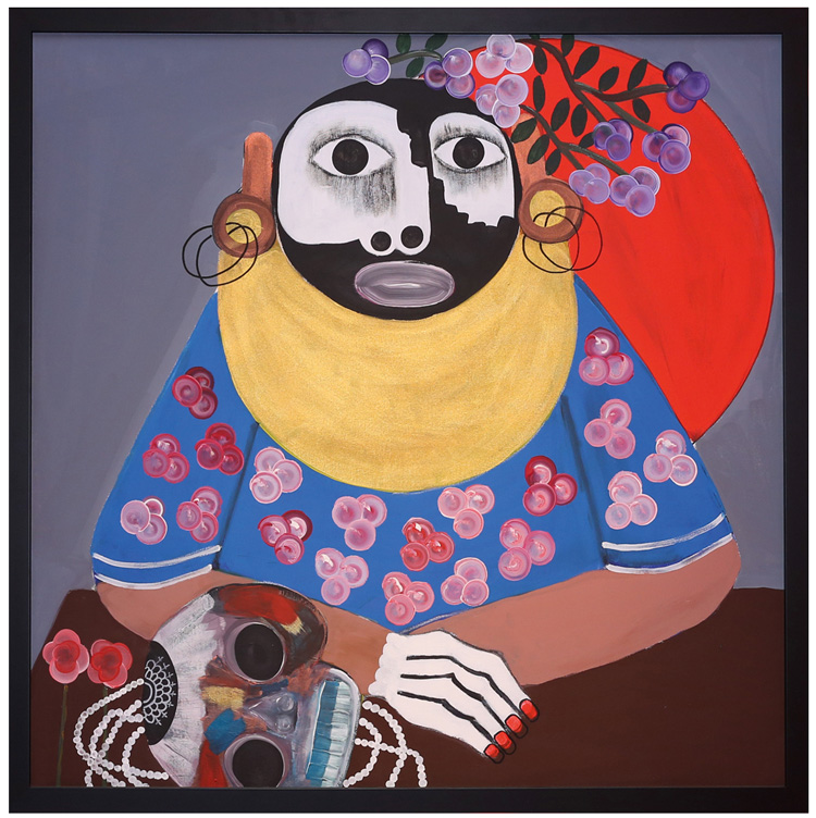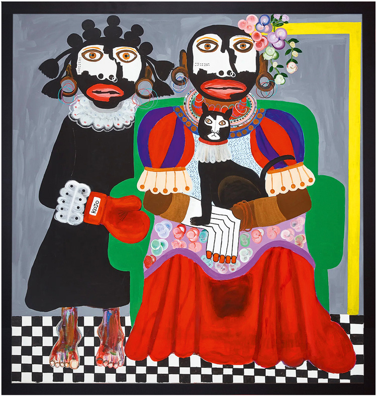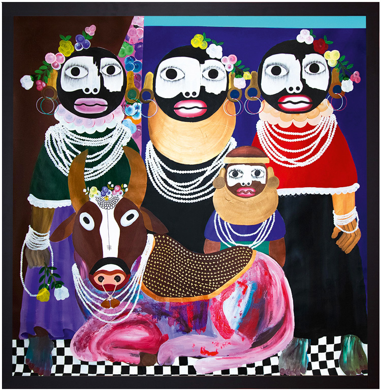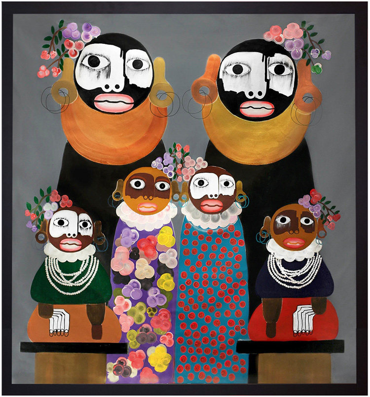В какой-то момент Марфо решил: он сделает свою Африку частью мирового культурного ландшафта, впишет ганских «кукол плодородия» в глобальный контекст. Его герои останутся африканцами, но будут говорить о проблемах, волнующих всех. Именно поэтому чернокожие героини Коджо, его fertility dolls, иногда носят платья с воротниками эпохи Возрождения и гроздья колье, похожие на сотуары Chanel. Атрибуты западного мира на африканских персонажах – не дары с миссионерского плеча. Это культурный код, позволяющий человеку любой национальности увидеть в полотнах что-то родное.
