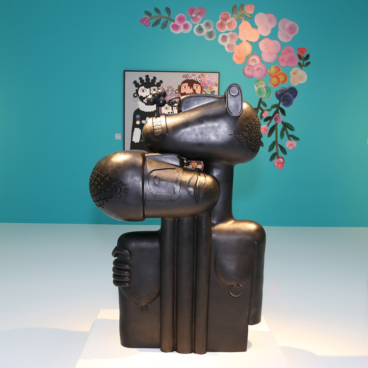 Кроме картин, на выставку в Баку приехала одна скульптура Коджо – «Сокровище сердца». Даже при беглом взгляде на нее перехватывает дух. Два черных силуэта, слившихся в один, две головы, но плеча тоже два. Смотрят в разные стороны – или друг на друга? Головы вытянутые, похожи на классические африканские маски. «Эта скульптура о том, что мы должны научиться принимать другого, – говорит Коджо, – принимать сердцем. Какими бы мы ни были, у нас больше общего, чем различий. В моей стране многие люди занимаются резьбой по дереву и делают разные фигурки. Сам я пошел в живопись, но иногда возвращаюсь к скульптуре, чтобы раздвинуть свои границы. Работа выполнена в черном цвете, и кажется, что она деревянная. На самом деле это бронза, я просто выкрасил ее в черный, чтобы она была больше похожа на те, что я видел в детстве. Мне нравится работать с формой. Когда-нибудь у меня будет большая студия, где смогу заниматься и живописью, и скульптурой».