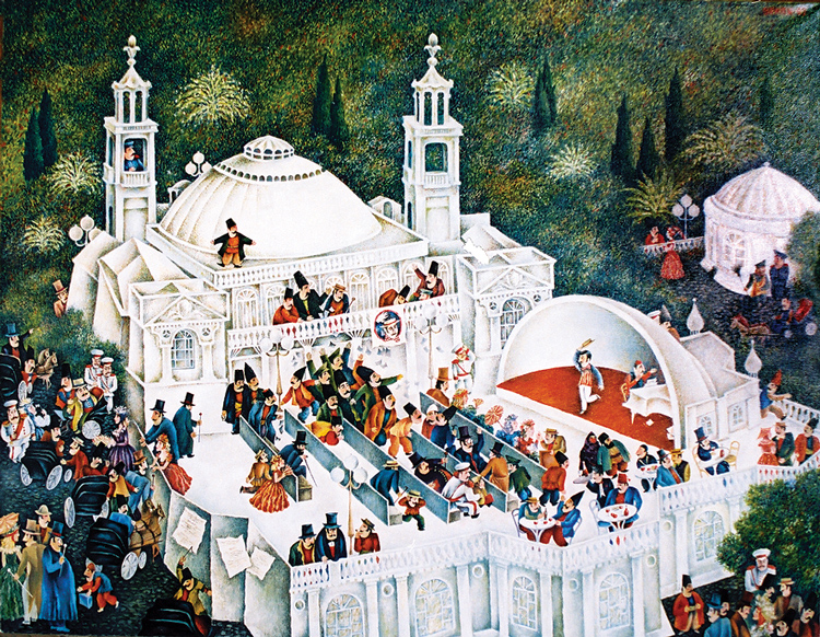 Пять лет назад посетители московского Музея Востока имели редкую возможность видеть выставку обоих Гусейновых «Азербайджанская сказка». Гусейнов-младший режиссер во всем, что делает. В своих живописных и графических работах он придумывает собственный зажигательный и ироничный миф о старом Баку. Его полотна похожи на театр: населяя их колоритными персонажами (танцорами, вояками, курортниками и торговцами) и волшебными существами (красными конями и факирами), он придерживается жесткой архитектоники – перед зрителем будто театральные макеты со сложно смонтированными декорациями, внутри которых обитают маленькие человечки.