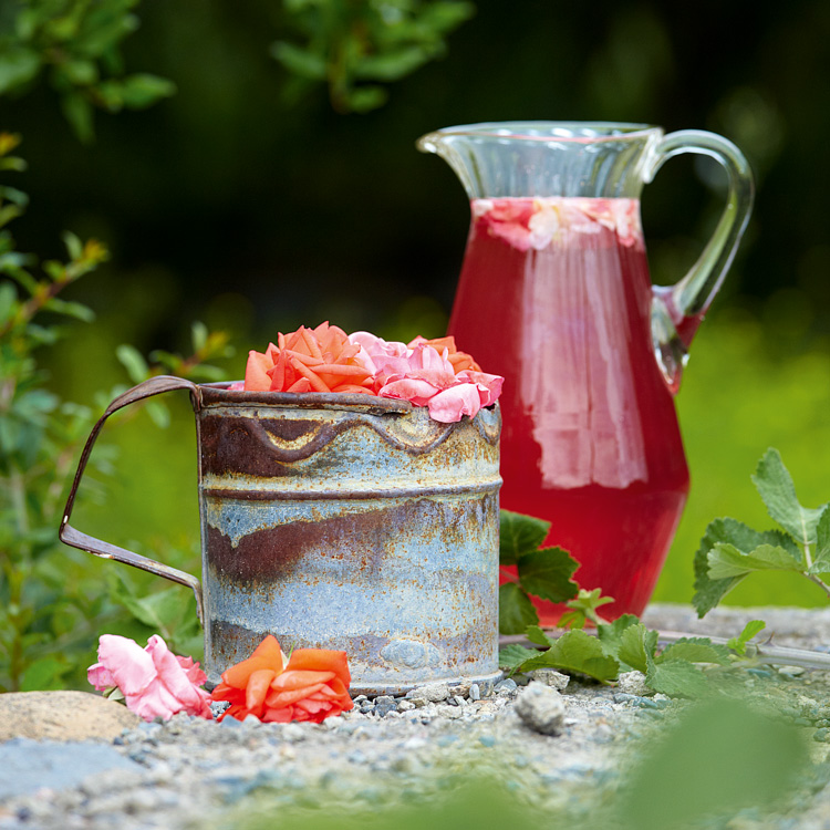 Конечно, в деревенском саду, где накрывают обед под старой чинарой, обходятся без стеклянных палочек. Вместо розового масла используют домашний настой: лепестки первых роз еще в начале лета пересыпали сахарной пудрой и выделившийся сок собрали в бутылочку. Сахарную воду и сироп готовят по отдельности, соединяя перед подачей.