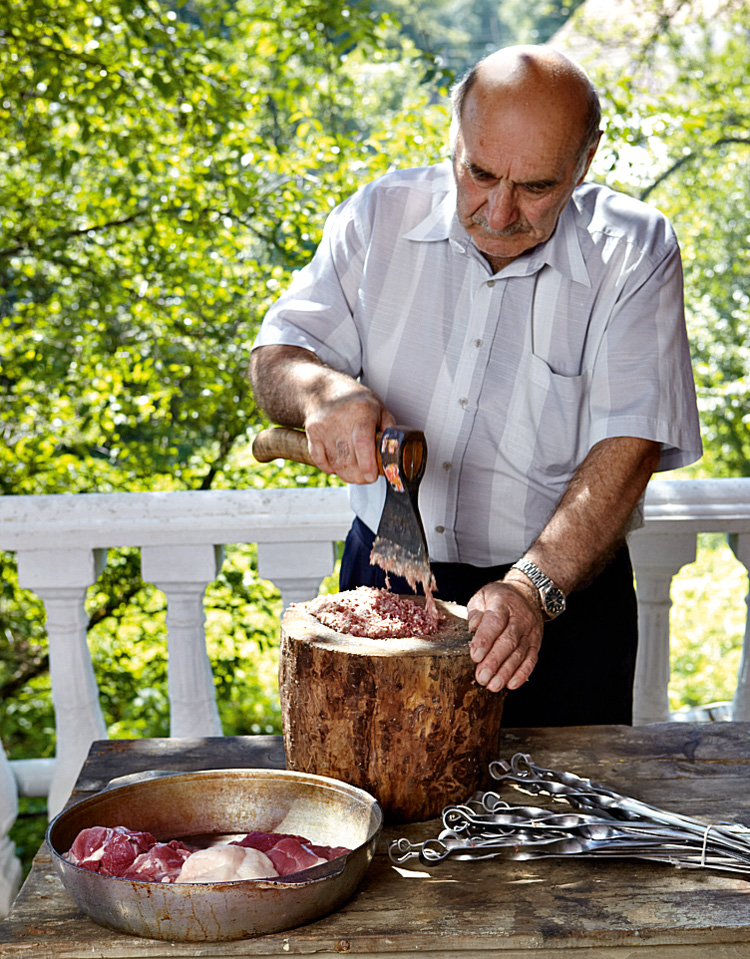 Позже в игру вступают мясники. Имеет значение все: возраст барана, пол, порода, рацион, зона происхождения (можно ли сравнивать гедабекского мериноса с черной карабахской овцой, нагулявшей такой огромный курдюк, что под него приходится подставлять тележку на колесиках?). Следующий этап – способ заклания и ювелирная, хирургической точности разделка туши, подразумевающая для каждого кусочка свое место в иерархии шашлыка. Самая ценная часть – мякоть задней ноги – идет на люля. Фарш для него рубят только вручную, затем вымешивают с предельной тщательностью, и для этого тоже требуется мастерство.