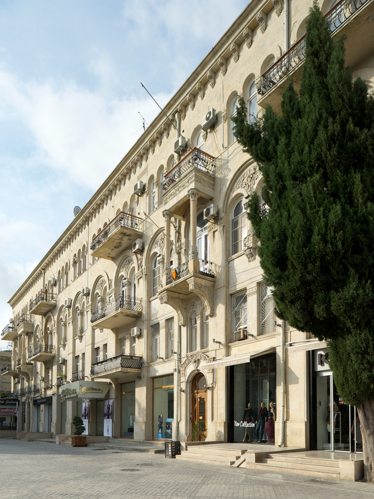 Ходят слухи, будто здесь когда-то жил Лев Нуссенбаум, по одной из версий – автор романа-бестселлера «Али и Нино», опубликованного под псевдонимом Курбан Саид. Теперь бывший доходный дом бакинского нефтяного магната Гаджибаба Пирверди оглу Ашумова на бывшей Михайловской улице занимают резиденции посольств Норвегии и Германии. Типичная для начала XX века постройка секционного типа с комфортной планировкой квартир стилизована под романскую архитектуру и увенчана живописным карнизом. Фасад четырехэтажного здания вертикально расчленен мощными балконами с ажурными металлическими решетками и ритмом окон, завершенным полуциркульными арками. Каменные кронштейны, пышно украшенные растительным орнаментом, в данном случае зарослями бамбука, – прием, свойственный бакинскому модерну.