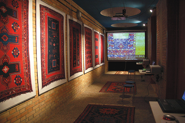 Комната, где экспонируется инсталляция Тарлана Горчу «Виртуальные ковры», напоминает пространство для чайной церемонии. Ковры на полу, ковры на стенах. Видеофильм, рассказывающий про школы и традиционные ковровые орнаменты. На первый взгляд кажется – этнический рай. Посетители не сразу обращают внимание, что висящие на стене ковры – серия бумажных постеров. В качестве отправной точки художник взял орнамент XIX века Гянджинской школы и на основе его элементов создал пять новых композиций. Свою работу Тарлан сравнивает с джазовой импровизацией, когда изначально выбранная мелодия, пройдя несколько кругов вариаций, меняется до неузнаваемости и в конце концов рассыпается. То же самое происходит и с традиционным азербайджанским орнаментом, элементы которого сперва теряют симметрию, становятся все более минималистичными, а затем и вовсе растворяются. Последняя работа представляет собой освобожденное от рисунка поле, окруженное лишь ковровым бордюром.