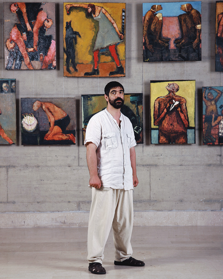 Нияз Наджафов похож на свои полотна: такой же динамичный, резкий, спонтанный, подкупающий откровенностью и странной логикой. Мы знакомимся на набережной, ожидая такси. Ветер поднимает на канале Джудекка волны: таксист никак не может причалить. На дежурный вопрос: «Как вам Венеция?» – неожиданно слышу нестандартный ответ: «Не нравится. Стамбул интереснее». Заметив мое удивление, Нияз тут же поправляется: «Окраины Венеции нравятся. А в местах, где полно туристов – Сан-Марко, Риальто – кажется, что эти люди своими фотовспышками крадут у города его сакральность. Детали куда-то исчезают, остаются лишь виды. А еще кругом эти киоски с масками. Я даже сюжет придумал: маски маршируют по городу, а туристы – все эти толпы японцев, китайцев, американцев – стоят в витринах, и маски на них глазеют». Нияз не любит, когда его с кем-нибудь сравнивают. А происходит это постоянно, поскольку его яркие полотна буквально напрашиваются на сравнение – с экспрессионистами, сюрреалистами… «Не люблю я весь этот сюрреализм. Не признаю школ и академий. Я никогда нигде не учился и всегда старался перерисовать тех, кто усердно занимался в разных художественных школах. Все, что я рисую, – чистый реализм». Последний тезис можно поставить под сомнение. Нияз тут же тащит меня к стенке, где в несколько рядов, тесня друг друга, висят его картины. «Это – вся моя жизнь. Спрашивайте про любую – расскажу». Присматриваясь к полотнам, указываю на самое сюрреалистичное: батарея центрального отопления обросла человеческим телом без рук. «Это вообще гиперреализм, – усмехается художник. – Зимой дело было. Батарея в доме сломалась. Холодно, а денег на ремонт нет. Вот я помолился перед сном и попросил у Бога тепла. Проснулся – обе батареи работают. А рук у них нет, потому что я для этого пальцем не пошевелил. Вот так. Говорю же: что пережил, то и пишу». К картинам Нияза – интерес особенный. Мимо его «бестиария» (так окрестили художники стенку с его полотнами) зрители равнодушно не проходят. Странные, то по-детски наивные, но чаще – болезненные, сюжеты буквально цепляют зрителя.