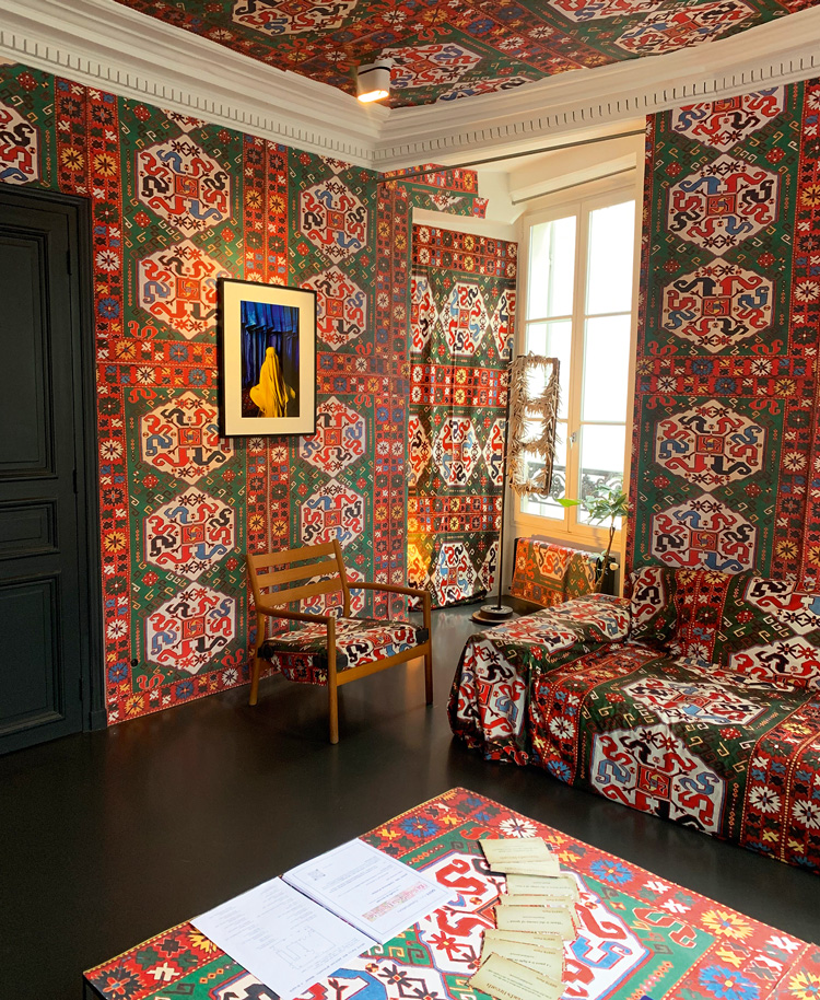 Работа Фарида Расулова стала фоном для всей экспозиции. 40-летний уроженец города Шуша работает в самых разных медиа – от живописи и скульптуры до анимации и 3D-графики. В GESTE он покрыл стены и потолок выставочного пространства ярким узорчатым азербайджанским ковром. Свою инсталляцию художник назвал «Караван-сарай щедрости». В древности караван-сараи были местом, где могли остановиться и отдохнуть путешественники и купцы, следовавшие по Великому шелковому пути. Именно благодаря этим людям выстраивались связи и процветала торговля между разными частями света – Азией, Северной Африкой и Юго-Восточной Европой. В работе Фарида цветное ковровое полотно превращается в мебель и украшение, становится прибежищем для человека, променявшего комфорт и стабильность на жизнь в непрерывном движении.