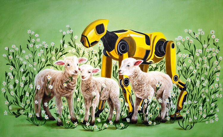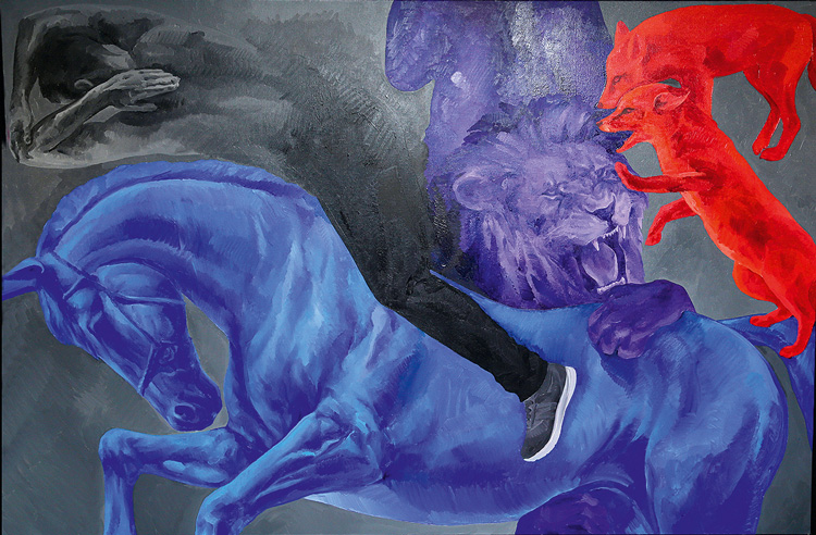 Поскольку возраст художников позволяет думать об этом с иронией, выставка вышла остроумной и легкой. Расулов радостно «пасет овец», сочетая сюжеты из кочевого прошлого и техногенного будущего, представляя образ овцы или ягненка как тотемный символ. Алакбаров черпает мудрость из коллективного бессознательного – вылавливает перлы из народных пословиц. Ахмед демонстрирует собирательный портрет косматого предка. А Гусейнов размечает территорию, отделяя культурно освоенную от первобытно дикой. Его работы образуют визуальные архивы, документирующие культурные слои ландшафта. Вместе авторы формируют образ своего творческого поколения.