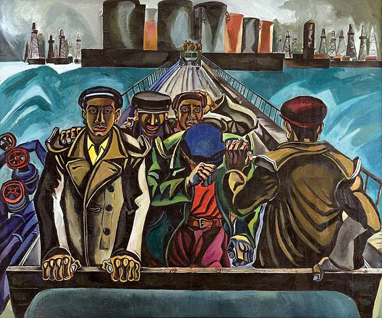 Представленная на выставке классическая работа Джавадова «Нефтяники (Возвращение со смены)» написана в конце 1950-х годов и предвосхитила «суровый стиль». Усталые люди покидают нефтяные платформы. Их лица похожи на морские окаменелости, а подступающие воды Каспия грозят поглотить их. Центральный персонаж спрятал лицо от порыва ветра – удивительный в своей смелости живописный жест.