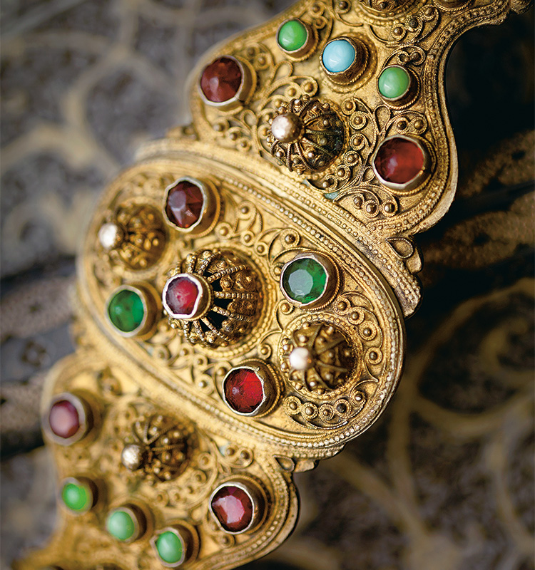 Пояс. Серебро, накладная филигрань, позолота, 49 вставок из пасты под бирюзу и цветного стекла. XIX в. К такому поясу прикрепляли фартук, который был частью традиционного женского костюма.
