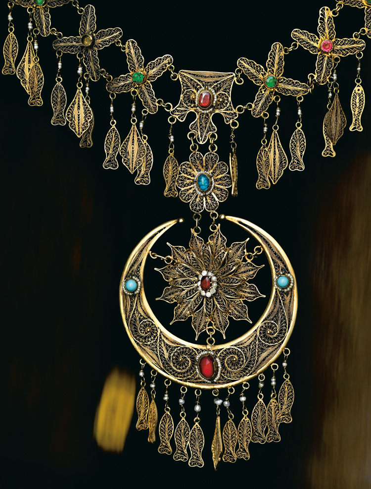 Колье. Золото, филигрань, вставки из цветного стекла и бирюзы, подвески с жемчугом. XIX в. Баку.