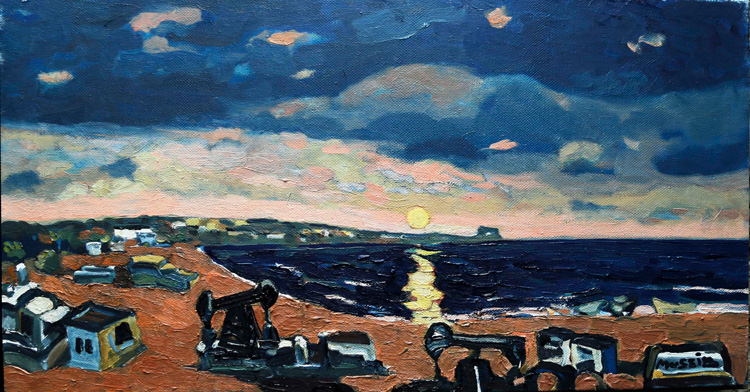 Силуэт высохшего дерева проступает на фоне неба. Далекий танкер будто застыл в оцепенении при виде розового заката. Нефтяные «качалки» в свете тревожного рассвета кажутся странными, неуклюжими существами. Каждый, кто бывал на Абшероне, моментально узнает этот пейзаж – аскетичный, выжженный солнцем и вылепленный ветрами Каспийского моря. Добавляя цветовые акценты в свободный, почти эскизный рисунок, наблюдатель и философ Мусеиб Амиров умеет зафиксировать и передать хрупкость мгновения так, что зритель слышит звуки ветра, ощущает аромат моря и жар белого солнца пустыни.