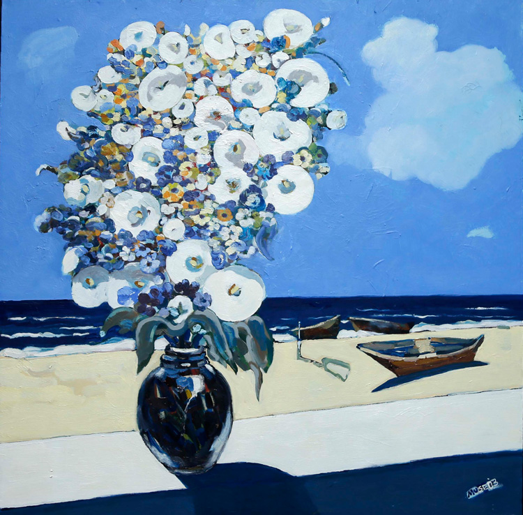 Чтобы передать насыщенность послеполуденной морской синевы, Амиров подчеркивает ее колористическим контрастом. Белоснежные цветы на подоконнике стоят в вазе, такой же темно-синей, как вода. Цветам, включаясь в цветовую перекличку, аккомпанируют облака и гребешки волн.