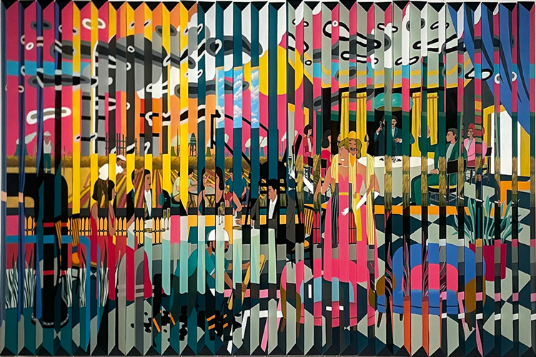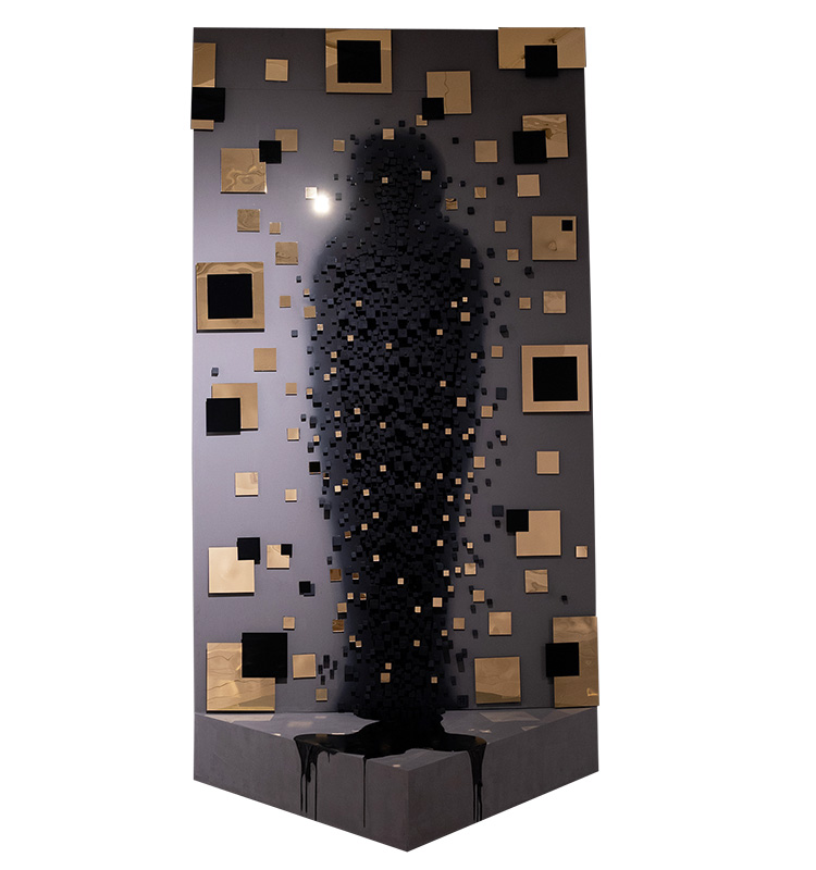 Две плоскости, сформированные конструкцией из треугольных реек, – это «Занавес» скульптора Орхана Гараева. Оптической иллюзией автор противопоставляет внешнему блеску достижений ежедневный труд. Зритель вынужден менять позицию, дабы сложить пестрые фрагменты изображения в единое целое.