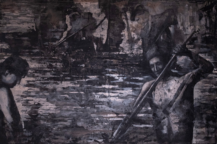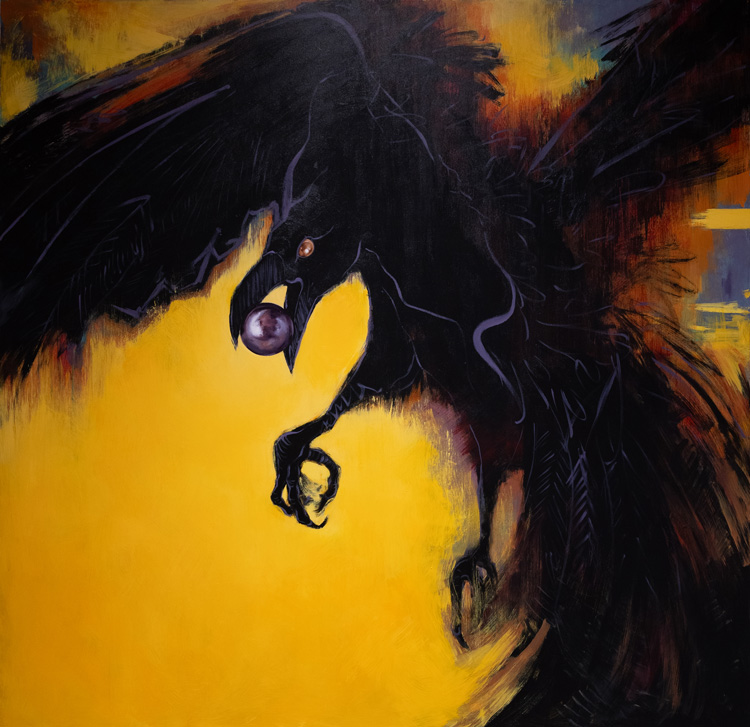 За историческими катаклизмами, в том числе технологическими, на эмоциональной живописной работе «Побочный эффект» Нигяр Фамильсой зорко наблюдает ворон. Ярко-желтый, почти ослепляющий фон заставляет зрителя пребывать в постоянном напряжении.