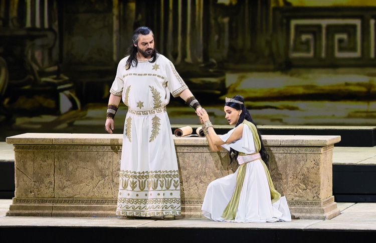 Сюжет «Идоменея» заимствован из греческих мифов. Участвовавший в Троянской войне царь Крита, возвращаясь домой, чуть не погибает при кораблекрушении. Спасший его морской бог Нептун берет с Идоменея клятву, что тот принесет в жертву первого человека, которого встретит на морском берегу. Им оказывается сын царя, и правитель Крита пытается обхитрить Нептуна, чем вызывает его гнев. Душевные муки Идоменея, понимающего, что если не сдержит клятву, то неминуемо навлечет беду на свой остров, драма сильного человека, вынужденного принимать сложное решение, – все это сыграно Гамидом Абдуловым безукоризненно. Несмотря на трагическое начало, у оперы счастливый финал: после того как влюбленная в принца девушка соглашается умереть вместо него, Нептун прощает всех. Единственное требование бога – Идоменей должен передать корону сыну. С чем тот не спорит. В течение спектакля Идоменей переживает целую бурю эмоций – и Гамид Абдулов мастерски показывает нам трансформацию царя, приходящего к умиротворению после ярости и отчаяния.