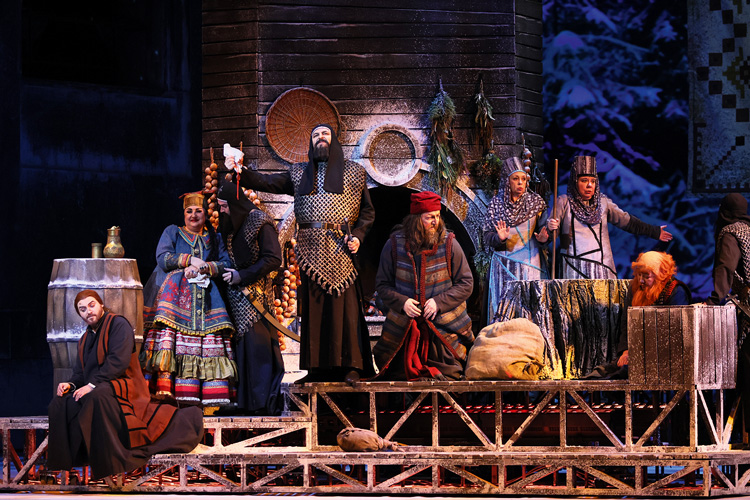 В опере чередующиеся сцены – то с мятущимся Годуновым, в каждом углу видящим призрак убиенного царевича Димитрия, то с самозванцем, влюбленным в Марину Мнишек и отправляющимся воевать Москву, поскольку красавица пообещала ответную любовь, только если он займет русский трон, – создают фантастические «качели напряжения». Гамид Абдулов в роли Отрепьева – авантюрист и предатель родной страны, но вместе с тем страстно влюбленный, готовый на все ради своей прекрасной польки. Спектакль, поставленный болгарской командой – режиссером Орлином Анастасовым (прежде успешным певцом, чей бас звучал на многих сценах мира) и художником Денисом Ивановым, – создан в рамках исторической традиции.