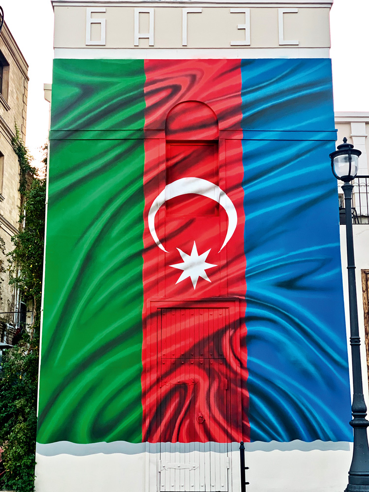 В Ичери шехер появилась новая достопримечательность: большой, во всю стену дома мурал, изображающий азербайджанский флаг.
