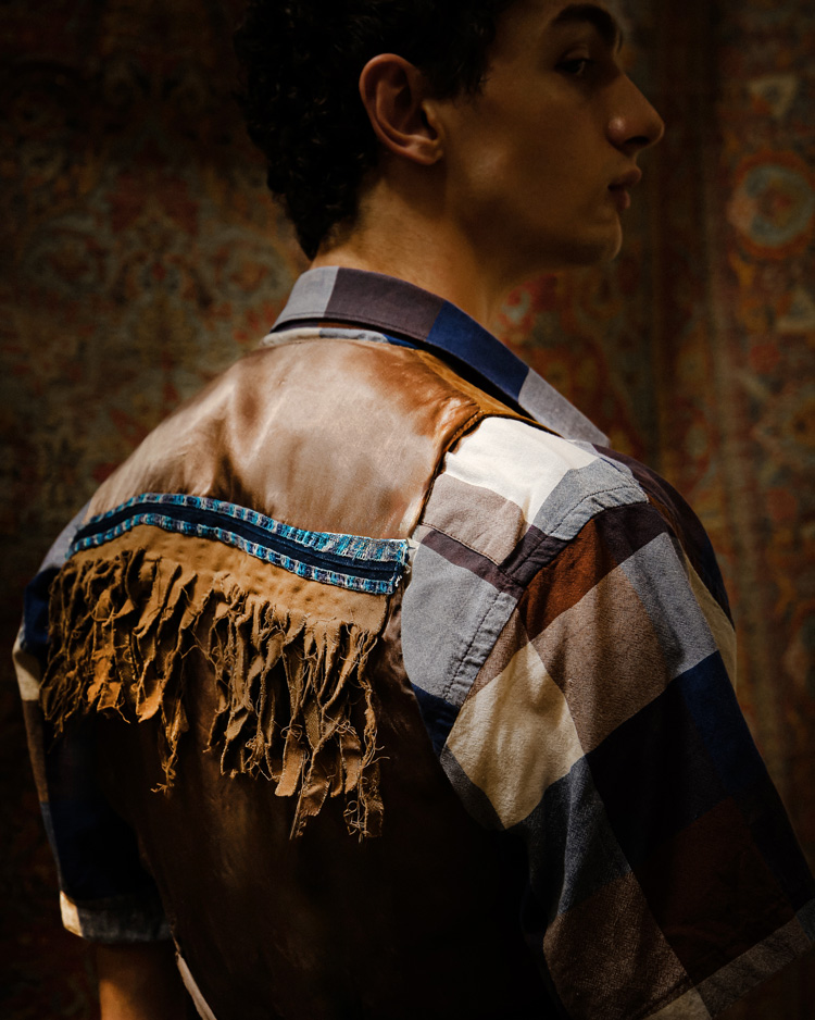 Первым делом он пошел учиться ремеслу портного. Экспериментировал сначала только с собственной одеждой: распарывал и резал, соединял разные детали, украшая их подручными средствами, – в результате получалось нечто совершенно новое. Вскоре он повторил опыт с предметами гардероба друзей. «Позже я начал изучать тему апсайклинга и ресайклинга, то есть вторичного использования и переработки, что еще больше вдохновило работать с ношеными вещами. Тренды в моде меняются стремительно, поэтому люди покупают все новые и новые предметы гардероба, не в силах остановиться. А ведь производство даже одной футболки требует больших затрат воды и энергии. Я же хотел создавать что-то из уже готовой одежды, вдохнуть в нее вторую жизнь, снизить экологический ущерб природе… Так появляются уникальные вещи с характером и историей», – говорит Эльнур. Он оборудовал ателье, пригласил трех опытных швей, набрал вещей в секонд-хендах и начал расширяться.