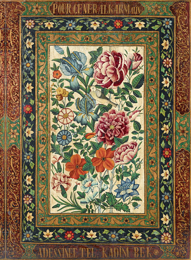 По стилю работа схожа с портретом Насреддин-шаха, хранящимся в Лувре. Она создана по снимку неизвестного тегеранского фотографа и предназначалась в подарок Николаю Николаевичу Кармалину (1824–1900), который в 1869 году был назначен военным губернатором Иревана. В бордюре внешней стороны створки имеется надпись по-французски: Pour général Karmalin. A’dessinée tel Kadim Bek («Генералу Кармалину. Рисовал некий Кадым Бек»).