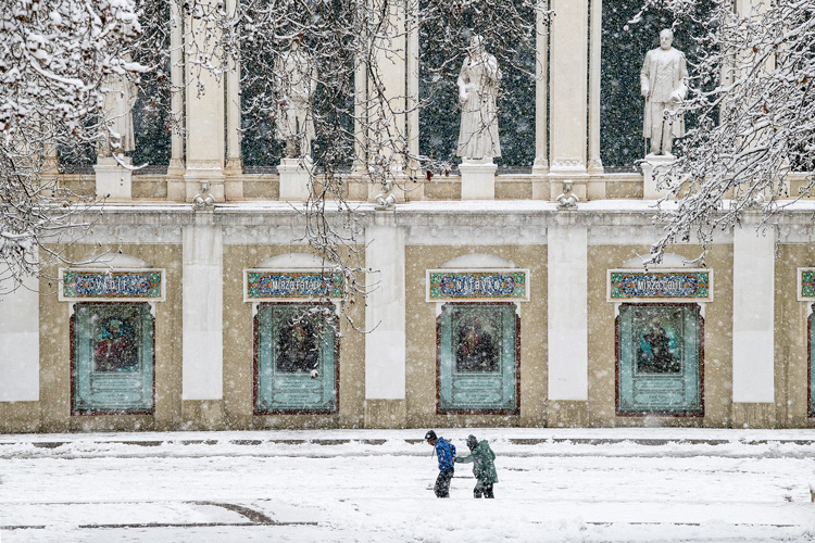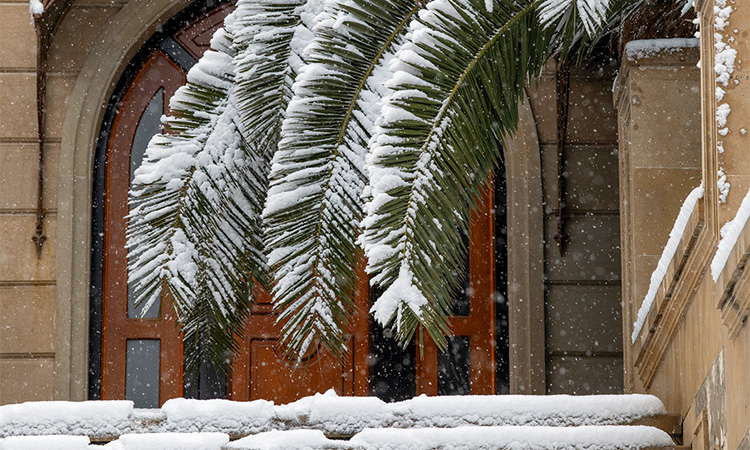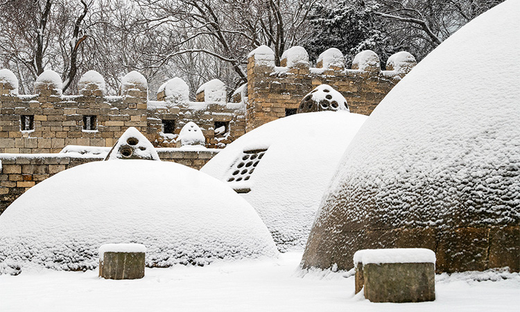 Снег, облепивший деревья, засыпавший дома и дороги, обычно делает городской пейзаж черно-белым: контрастным и холодным. В Баку же все иначе: здесь повсюду проступают теплые оттенки известняка, которым облицованы здания в центре.