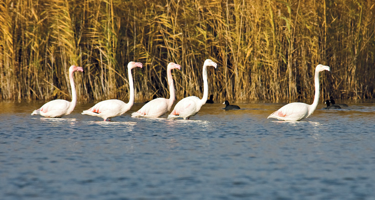 Фламинго оказались чемпионами по выдержке и подпустили лодку метров на тридцать. Собираясь в крупные стаи, фламинго на своих длинных ногах шагают по илистому дну мелководья и в поисках корма опускают изогнутый в форме бумеранга клюв в воду. Розовое оперенье крыльев напрямую зависит от их рациона, который привязан к водоемам с соленой водой. В неволе, не имея привычной пищи, фламинго могут практически полностью потерять свой оригинальный оттенок. У вида фламинго, зимующего в Азербайджане, только крылья имеют ярко-розовый окрас. Остальная часть оперенья или белая, или обладает еле заметным розовым оттенком. Когда они пасутся на озере, то не особенно выделяются среди других его обитателей. Но как только эти удивительные птицы взлетают, небо озаряют их огненные крылья с черной каймой.