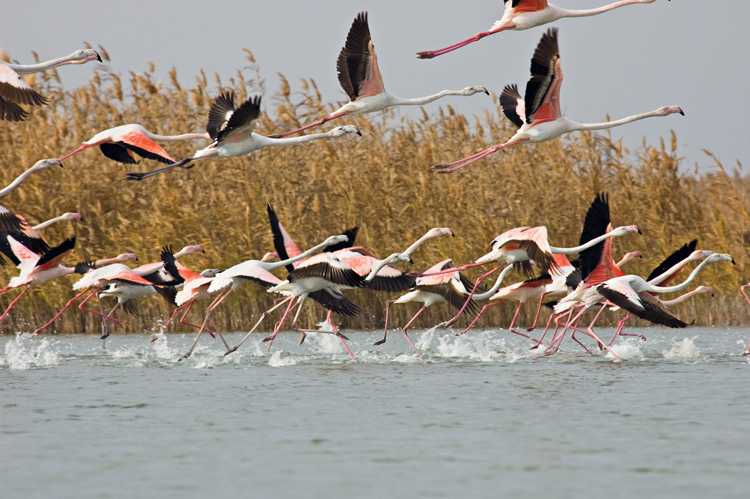 Если попробовать подплыть к птицам совсем близко, то мгновенно срабатывает кашкалдаковская сигнализация. Первыми реагируют на крики и шум от взлетающих крыльев лысух аристократичные цапли. Они невозмутимы, как принцы крови, но быстро встают и уходят. К ним почти сразу присоединяются бакланы. Стая пеликанов больше доверяет собственным часовым и оставляет сигналы шумной толпы кашкалдаков без особого внимания. Но стоит только уменьшить дистанцию доверия, и эти птицы с гигантским клювом тяжело поднимаются в воздух. Полет пеликана впечатляет не менее, чем полёт фламинго. Когда такой мини-птеродактиль медленно машет массивными крыльями над головой, соглашаешься с гипотезой палеонтологов о происхождении птиц.