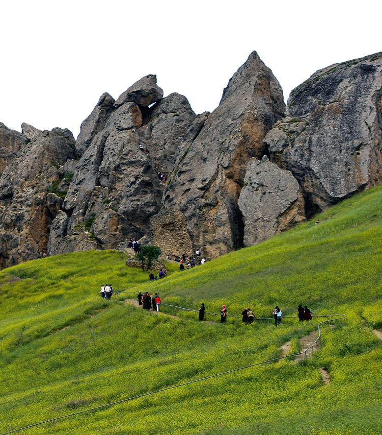 «Гору пяти пальцев», которая стоит у самой трассы Баку–Губа, редко проезжают, не притормозив. У дороги всегда многолюдно. К вершине, откуда открывается вид на Каспий и на Большой Кавказ, ведет крутая тропа, отполированная тысячами ног, и мало кто из бесконечного людского потока совершал это 15-минутное восхождение просто ради любопытства. Большинство приходит попросить – об удаче, о здоровье, о ребенке... Молитву сопровождают древними ритуалами: складывают пирамидки из камешков, повязывают ленточки желаний, целуют гору. Некоторые остаются ночевать, в палатках, и потом рассказывают, что посреди ночи слышали голос, читавший нараспев Коран, – голос этот, верят паломники, принадлежит самому Хызыру.