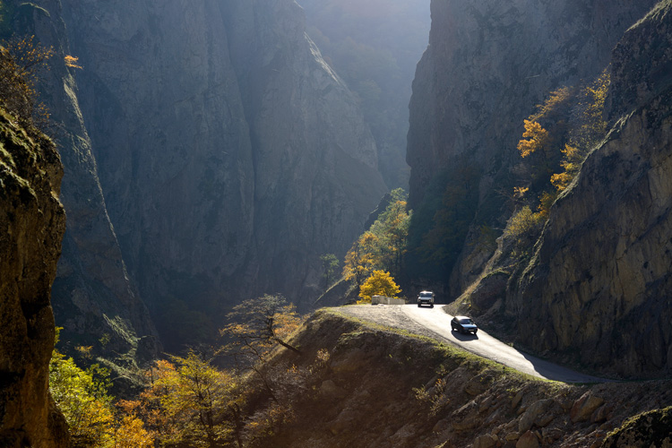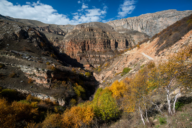 Охристые оттенки камня, зелень, золото и багрянец листвы – увидев настолько живописный пейзаж, немедленно хочется встать к мольберту и запечатлеть эту роскошь. За неимением холста, впрочем, сгодится и смартфон. Аккомпанементом же к этой картине станет мощный рокот Гудиалчая.