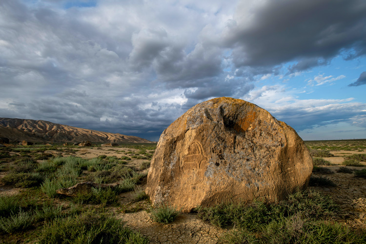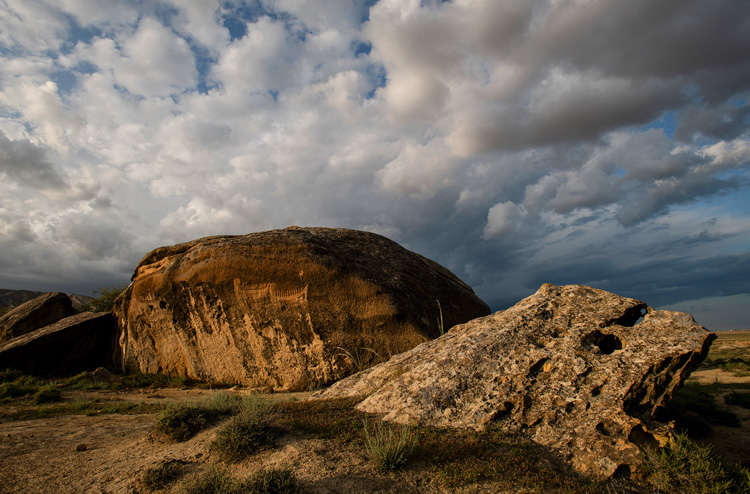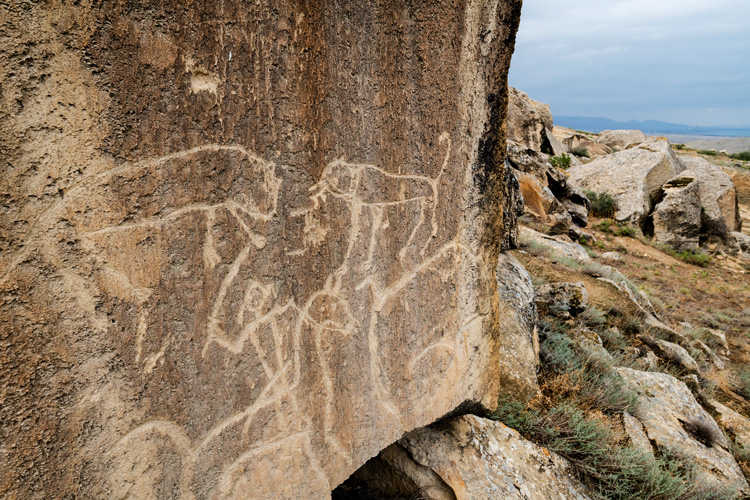 Покинув Беюкдаш, мы перемещаемся к подножию Джингирдага («Бога-горы»), где на холме Язылытепе («Расписной холм») местные пастухи в прошлом веке обнаружили петроглифы. Все случилось примерно как в рождественской истории: первыми пришли пастухи, потом подоспели археологи. Эти изображения археологи Исхак Джафарзаде и Иван Щеблыкин исследовали первыми, хотя по датировке они много младше Беюкдаша. Туристы сюда добираются редко, усеянная камнями земля кажется забытой и нетронутой.