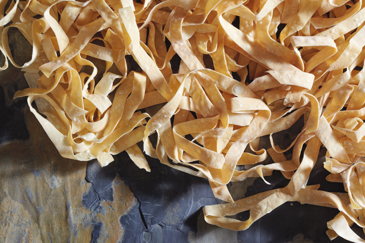 Из муки, яиц, воды и соли замесите тесто – не очень крепкое, но и не мягкое, разделите его на шарики диаметром около 15 см. Каждый шарик раскатайте так, чтобы получились круги толщиной примерно 0,3 см. Обильно посыпьте мукой, чтобы тесто не слипалось. Сверните из каждого круга колбаску, порежьте ее на полоски толщиной 0,5 см, встряхните и подсушите. Чтобы лапша не только быстро подсохла но и приобрела золотистый оттенок, уложите ее на противень, поставьте в духовку на 5–10 минут при температуре 180 градусов.