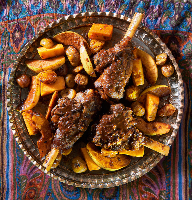 Смешайте специи и соль, натрите ими голени ягненка и оставьте мариноваться на два часа, чтобы мясо пропиталось и дало сок. Обжарьте голени на топленом сливочном масле на раскаленной сковороде до образования корочки. Добавьте предварительно обжаренный до золотистого цвета нарезанный лук, влейте абгору и дошаб и тушите около трех часов. Периодически подливайте куриный бульон, чтобы сохранялась соусообразная консистенция подливы. За полчаса до готовности добавьте ошпаренные каштаны, кусочки айвы, тыквы и сливу.