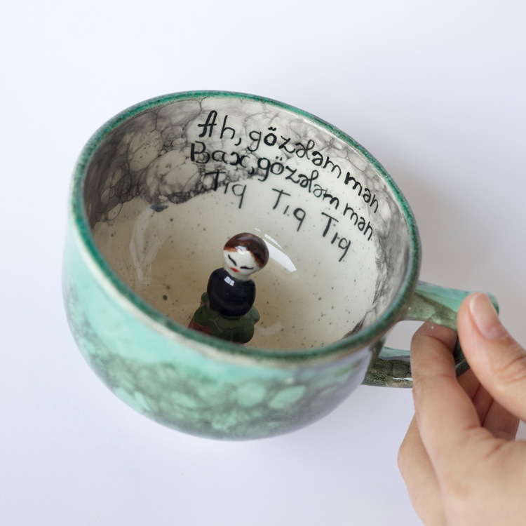 А в чашках Zingirov на донышке (не допьешь – не увидишь!) часто живет персонаж азербайджанской сказки Тык-Тык ханым. Этакая воображуля-капризуля девочка-букашка, не слишком положительная, но чертовски обаятельная. Цитаты из Тык-Тык ханым Умай наносит на кружки. На одной, например, написано: «Я подвела глаза сурьмой, вышла на улицу, ищу друга для себя, где же ты, друг, приходи быстрее! Твоя Тык-Тык». Из таких чашек дети с удовольствием пьют даже нелюбимое теплое молоко, проверено.