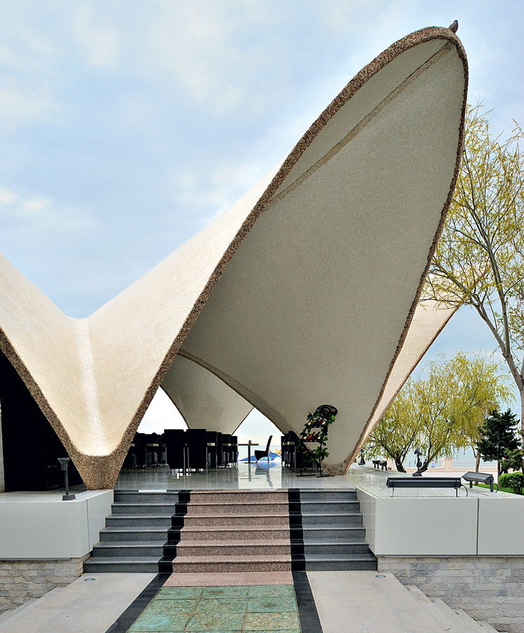 Великолепный бакинский бульвар зодчие всегда боялись трогать, понимая, что если здесь что-то и строить, то только очень ему созвучное – легкое, простое, лаконичное, динамичное. Эпоха хрущевской оттепели как раз и породила такое явление, как павильонный модернизм. Это небольшие, сомасштабные человеку, открытые (порой прозрачные) сооружения органических (природных) форм и общественного назначения – как правило, временные. И «Жемчужина» стала подлинной жемчужиной этого стиля. Удивительно, что она дожила до наших дней и при этом сохранила свою функцию. Впрочем, может быть, именно благодаря ей. Ведь многие поколения бакинцев помнят не столько образ бетонной кувшинки, сколько здешние люля-кебабы! «Когда-то я очень любил есть такие штуки на бульваре в кафе «Жемчужина» – завернутые в лаваш, посыпанные луком и сумахом, – читаем в одном из интернет-мемуаров. – По вечерам там гуляли люди, играла музыка из индийских фильмов, а с моря дул свежий нефтяной ветерок…»