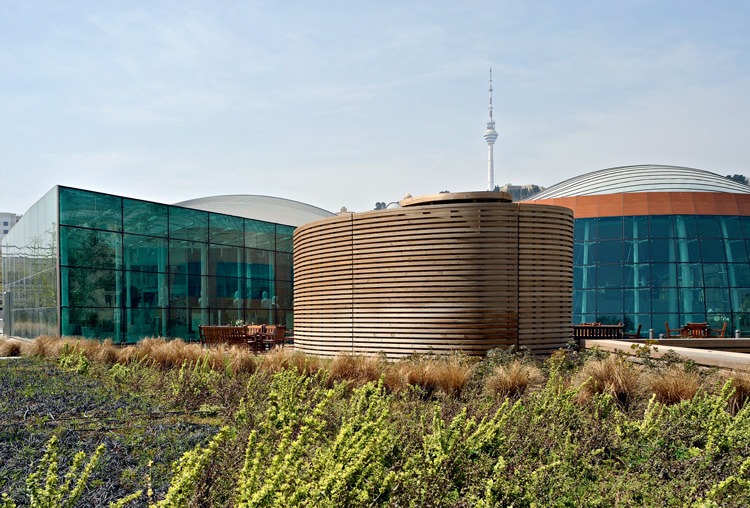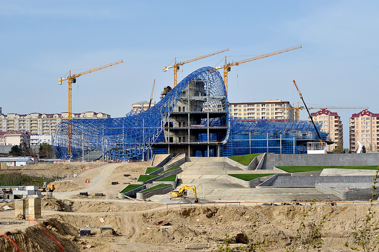 У всех звезд мировой архитектуры есть свой фирменный стиль. Их постройки узнаются, а порой и приедаются. Но сила подлинных мастеров именно в том, что они умеют сопрягать свой стиль с особенностями места и получать на выходе новое качество. Когда я издалека увидел эту стройку (еще не зная, что это «оно»), едва не закричал: «Туда!» – настолько красивым выглядел этот ни на что не похожий объект, свернувшийся клубочком на высоком зеленом холме и обтянутый синей сеткой. Это, кстати, важный бонус – красивая стройка (что в Москве, увы, большая редкость). Здания еще нет, но форма его уже очевидна – и она хороша. Прозрачность процесса позволяет понять и то, как здание устроено, и как все будет внутри: этажи завиваются вокруг центральной «колбы», уже отлитой в бетоне. Непривычное благоустройство (разбросанные по склону сталактиты) остроумно метафоризирует бакинские террасы, а тени от сетки превращают все это в какой-то сумасшедший арт-объект... Тогда как на самом деле там разместятся музей, конференц-зал на тысячу мест, трансформируемая сцена, библиотека, пресс-центр и много других полезных учреждений.