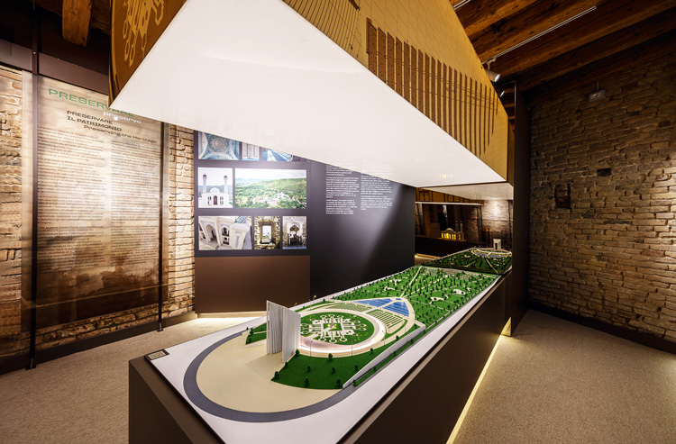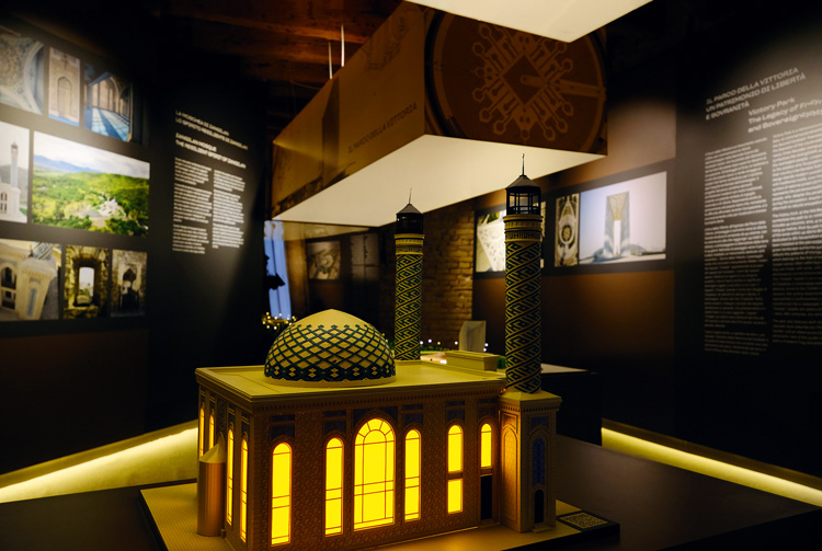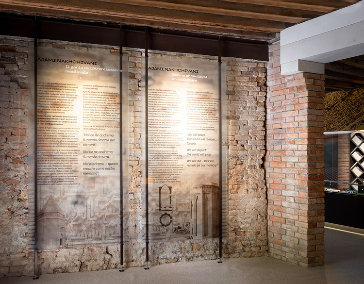 В пространстве павильона выставлены фотографии башнеобразных мавзолеев-усыпальниц Юсифа ибн Кусейра и Момине-хатун – строений, в которых проявился фирменный стиль Нахчивани. В плане эти сооружения представляют собой призмы или многогранники с купольными перекрытиями; арочные углубления и геометрический орнамент визуально удлиняют и облегчают конструкцию. Для средневековой архитектуры подобные решения выглядят революционными. Современники называли Аджеми Нахчивани «шейх-ул-мухандис» – «глава инженеров»: уже в XII веке он создал свою архитектурную школу, чьи ученики были востребованы на всем Ближнем Востоке. Ему приписывают слова, высеченные на мавзолее Момине-хатун: «Мы уйдем – мир останется, мы умрем – это останется памятью».