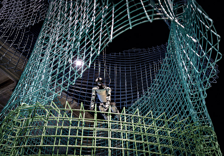 Раздел Биеннале, посвященный искусственному интеллекту, исследует внедрение роботов в строительные процессы и перспективы сотрудничества людей и машин. Здесь в центре внимания китайско-швейцарский проект «Сон робота» (A Robot’s Dream, авторы – группа Gramazio Kohler Research, MESH и фотограф Армин Линке). Инсталляция выглядит пугающе: человекоподобный робот парит над конструкцией из арматурных сеток, напоминающей тюремную камеру (сетки эти сплетены самим роботом). Периодически он совершает хватательные движения и снова засыпает. Комментарий к проекту подсказывает, что роботу снятся кошмары: ему тяжело жить в мире, созданном людьми и для людей. Зрители, в свою очередь, тоже испытывают тревогу, когда с потолка к ним тянет руки андроид-сомнамбула.