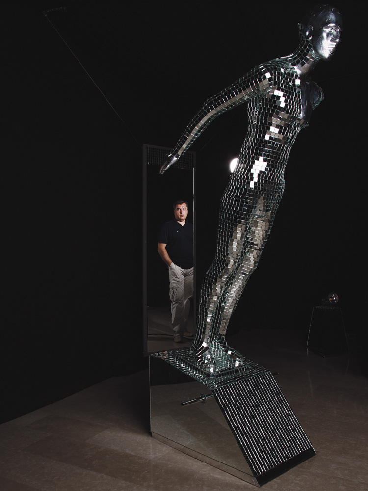 Теймур Рустамов: «Это очень личная работа. По сути, человек, раскинувший руки и готовый взлететь, – я сам. Эти зеркальца – мои впечатления с 1960-х годов по сегодняшний день. Рядом со мной, готовящимся взлететь, – земной шар. Похоже на монументальную скульптуру советских времен. Я сам из того времени. А эта поза означает: хочу летать и боюсь летать. Поэтому фигурка человека стоит так низко. Инструкция по технике безопасности для меня – островок надежды. Самолет упал, но инструкция, пусть и обгоревшая, осталась – это значит, что спасение возможно. I trust. В слове trust спрятана анаграмма моего имени. Эту работу я посвятил своему роду. Мой папа окончил Строгановку и принимал участие в первом конкурсе работ, посвященных полету в космос. И я к этой теме вернулся. Но своего взлетающего человека специально снял с пьедестала. Я из поколения людей, которые боятся высоты. Те, кто родился в 1950–1960-е годы, меня поймут».