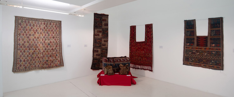 Экспозиция показала, как разные виды ковра использовали в быту в разных регионах Азербайджана. Особенно универсальными были безворсовые. Вот переметная сума хейбя из Ширвана начала XX века: сотканная из смеси шерсти и хлопка, она состоит из двух частей и покрыта гармоничным сочетанием геометрического и растительного орнамента. А вот мафраш, ковровое изделие, в котором родители невесты отправляли в дом жениха приданое – постельные принадлежности, покрывала и одежду. Образец, представленный на выставке, соткан в Баку в конце XIX века и украшен узорами из мифических птиц и растений на темно-красном и голубом фоне. Мафраш крепили на спине лошади, мула или верблюда с помощью широкой ковровой веревки – оркана, а сверху накрывали еще одним ковриком с простыми вертикальными полосами – джеджимом, его тоже привезли на выставку. На шерстяных поверхностях старинных чулов – попон, защищавших от холода лошадей, верблюдов и быков, – из Ширвана и Карабаха конца XIX века выстроились в ряд фигурки зверей, в том числе драконов, символизирующих благополучие. А так называемые лямагабагы, сетки с ковровой верхней частью, можно было встретить в Азербайджане еще в начале XX века: они служили перегородкой в палатке скотовода или земледельца.